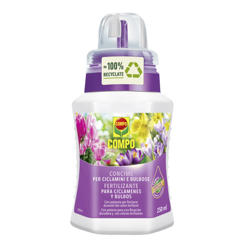 →Abono: Puedes ayudar a tu ciclamen con algo de abono líquido, pero hazlo solo cuando la planta esté empezando a desarrollar los botones de flor. El abono es muy importante para mantener tu ciclamen sano y potenciar su crecimiento y el color de la flor. Te recomendamos el abono especial para ciclamen de COMPO, un alimento completo para tus ciclámenes.